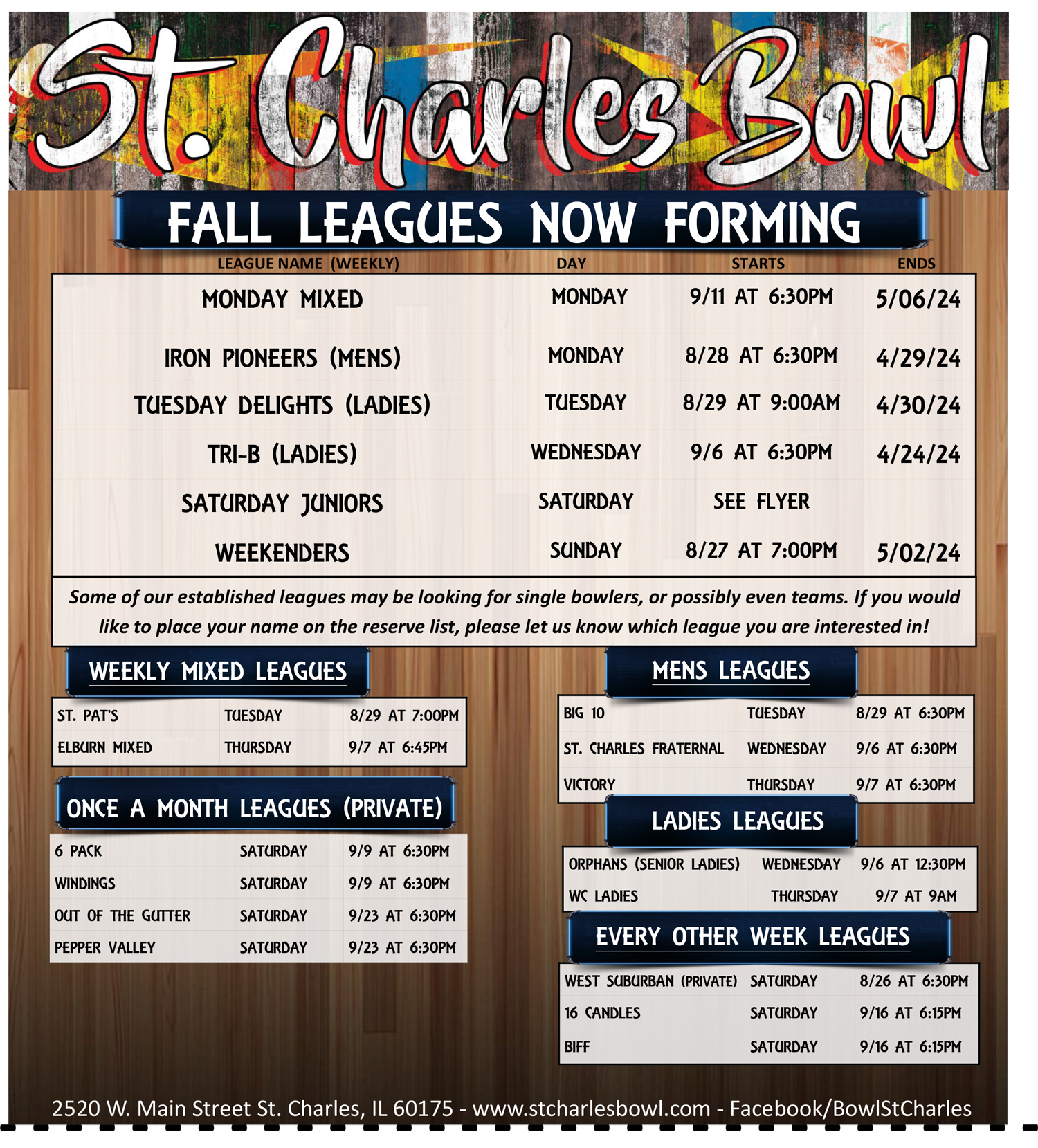 Join a League and join the FUN! St. Charles Bowl League Bowlers receive exclusive privileges and benefits. These include discounts on open bowling, food and beverages, birthday parties, company parties, and more. Leagues are starting the end of August.