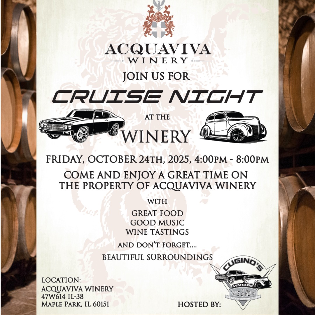 Join us for Cruise Night at Acquaviva Winery in Maple Park - Presented by Cugino's Vintage Cars! Bring your vintage, unique, or favorite ride and show it off in style! Free entry, no registration required. Awards Ceremony Winners selected by Acquaviva Winery. More details BELOW