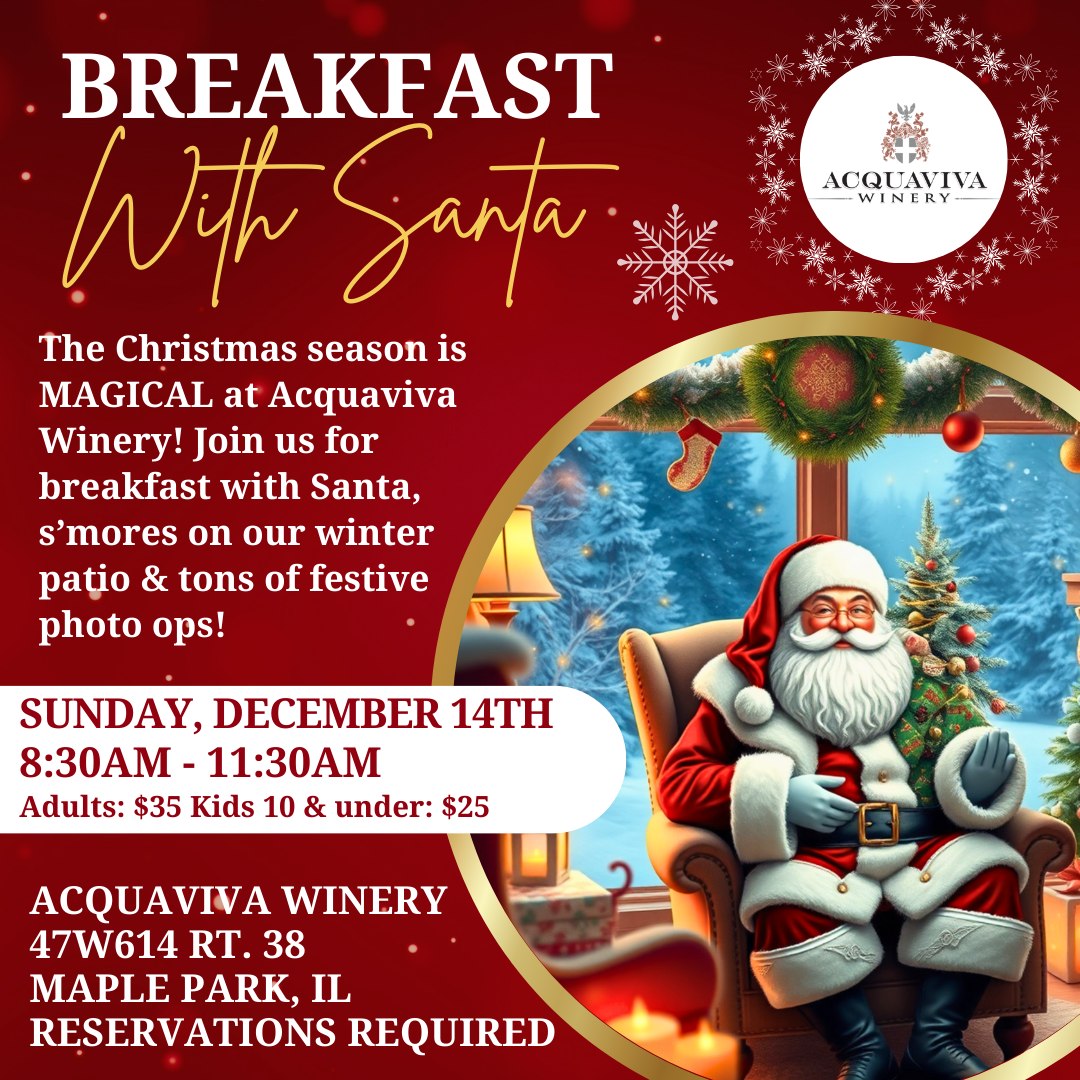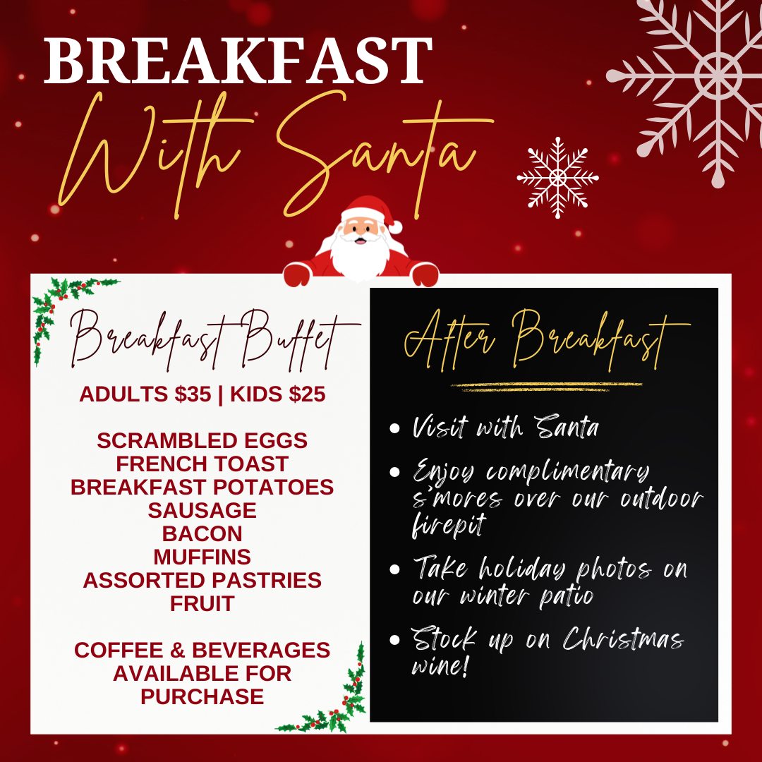 Bring the whole family to our festive Breakfast with Santa! Enjoy a delicious breakfast buffet featuring seasonal favorites, photo opportunities with Santa in a cozy winery setting, complimentary s'mores over our outdoor firepit, gorgeous winter patio for photos, mulled wine samples for adults & more! More details BELOW