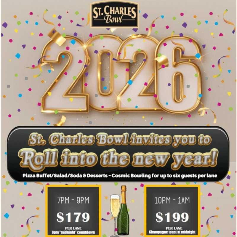 Roll in to the New Year having a ball at St. Charles Bowl! Get your friends or family together, choose your time and reserve your lane! Happy New Year! Details BELOW
