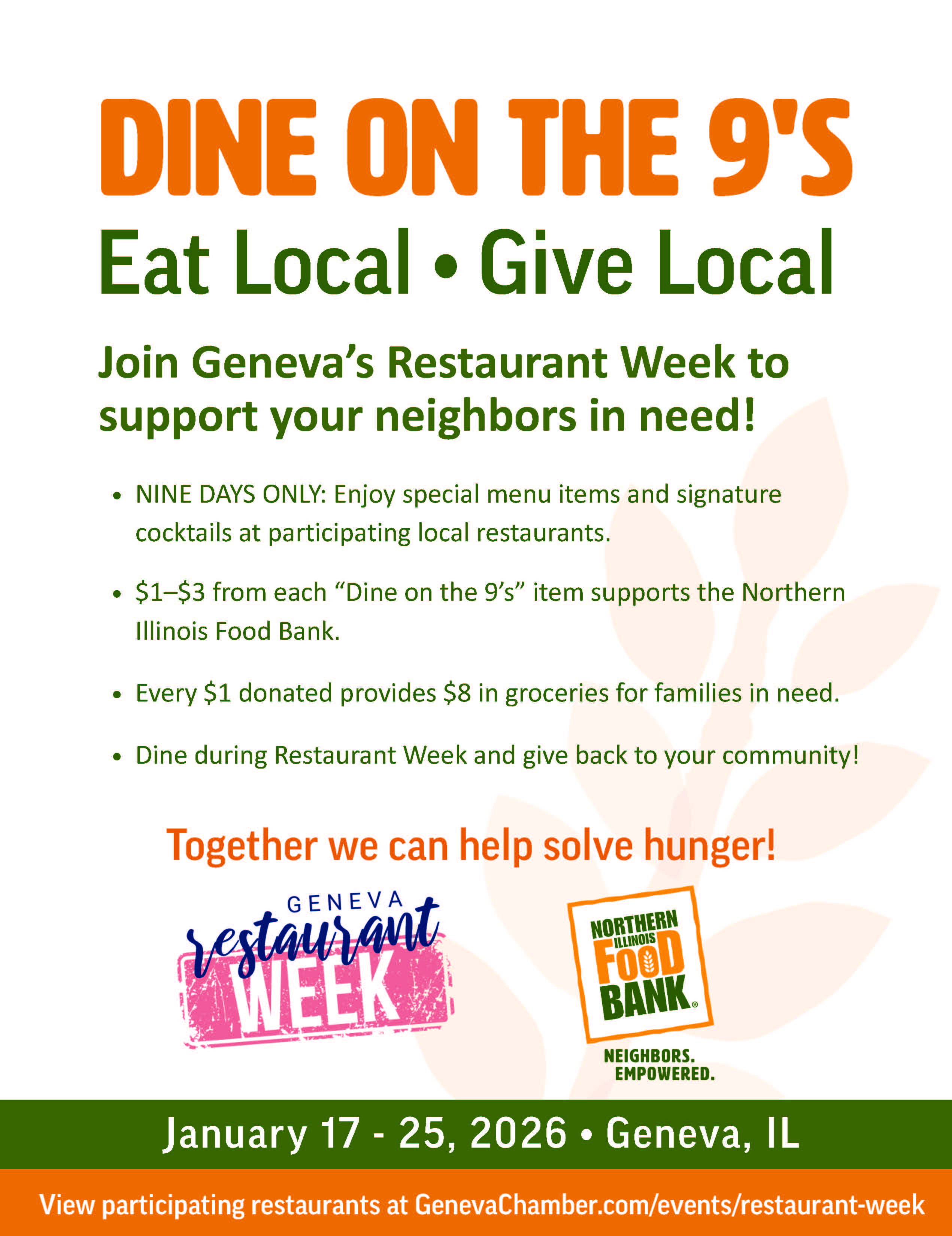 Geneva Chamber of Commerce is pleased to highlight culinary excellence by offering the Geneva Restaurant Week - an entire week of delicious discounted dining at some of Geneva's finest restaurants! For NINE DAYS ONLY foodies will be able to eat their hearts out at participating restaurants that will offer lunch and dinner menus reflected for DINE ON THE $9's. Some are per person, some are for two and some are options you will only find during Restaurant Week. Tickets and passes aren't necessary for this week of discounted dining; show up at any participating location or call ahead to make a reservation to ensure your chance to indulge with these deep discounts. A portion of the proceeds of menu items sold will be donated to Northern Illinois Food Bank. More details BELOW.