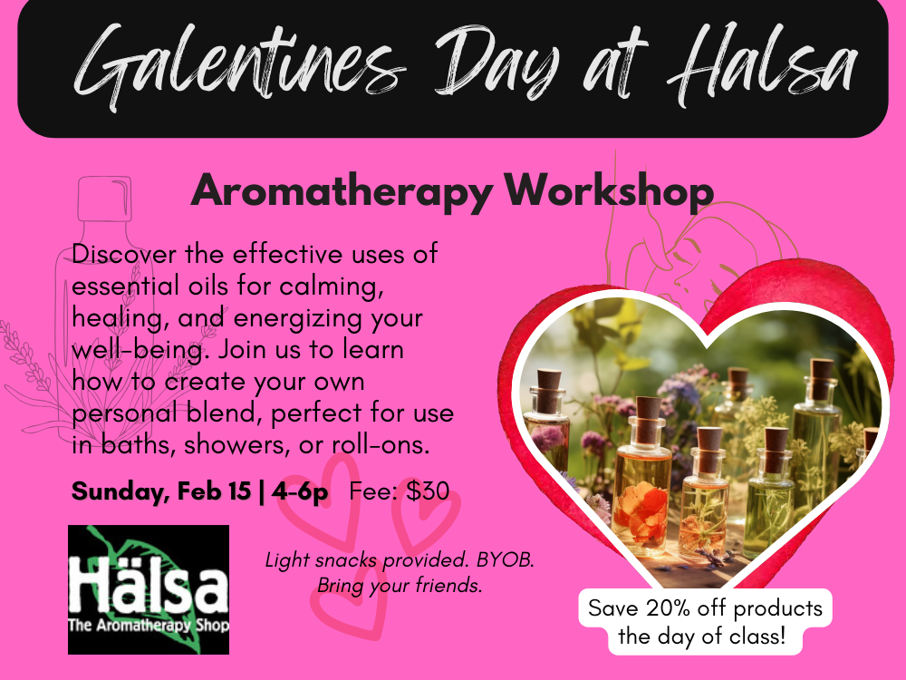 Join us for a Galentine's Aromatherapy Workshop to make your personal blend for your wellbeing! Can be for bath, shower or roll on for daily use. Light snack will be provided and you are welcome to bring your friends and BYOB! More details BELOW