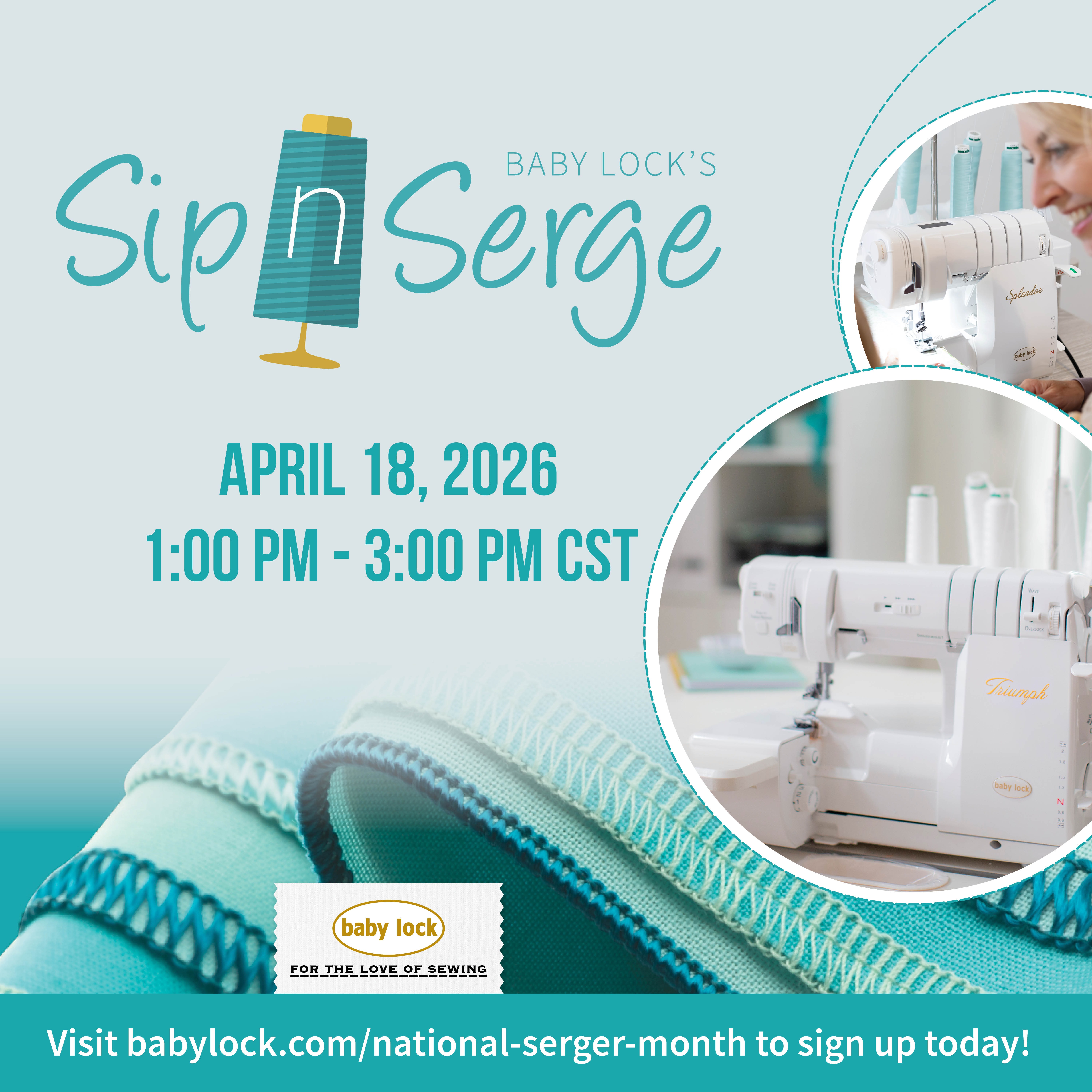 Join us in-store for a fun and inspiring event to celebrate National Serger Month! Streaming live from Baby Lock headquarters, you'll get to watch Baby Lock's top team of serger experts and special guests showcase their favorite techniques, must-have accessories, and inspiring projects. Enjoy fun serger projects, exclusive offers, special prizes, and more - don't miss this chance to learn, connect, and think creatively about your serger!