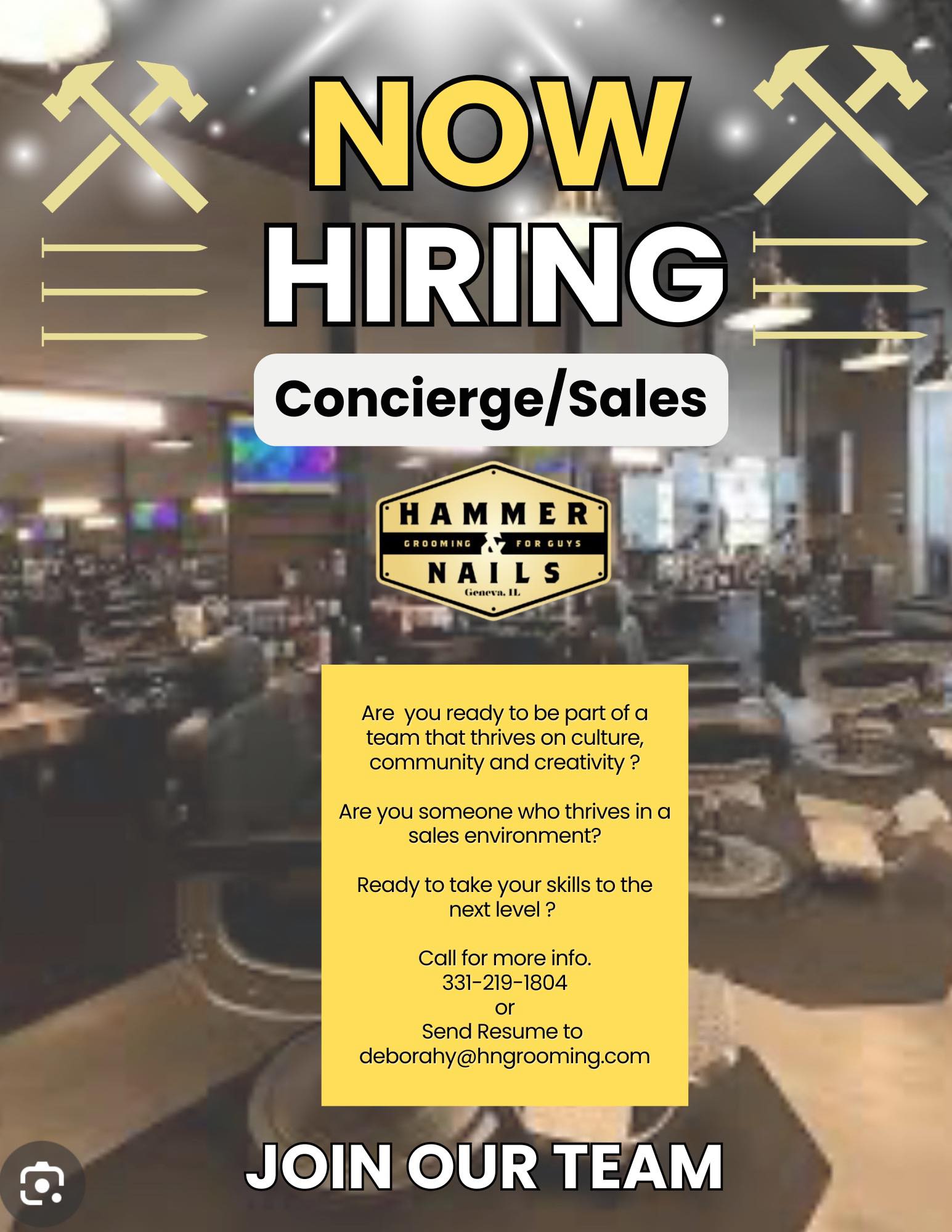 Send resume to deborahy@hngrooming.com or call or text 331-219-1804.